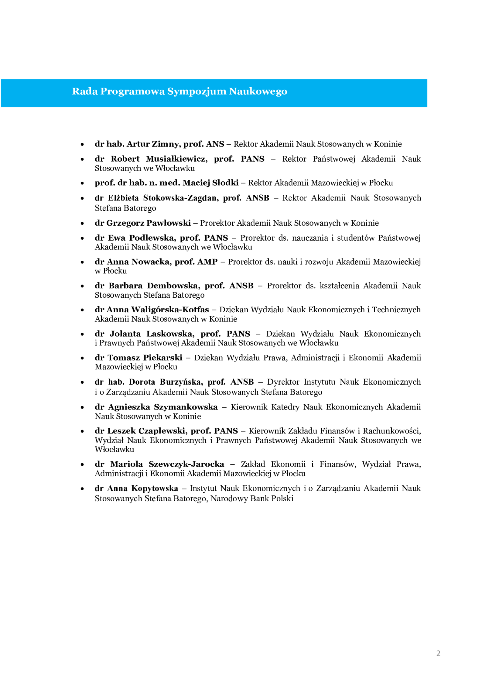 - dr Karina Zawieja-Żurowska - Akademia Nauk Stosowanych w Koninie, Wydział Nauk Ekonomicznych i Technicznych, karina.zurowska@konin.edu.pl